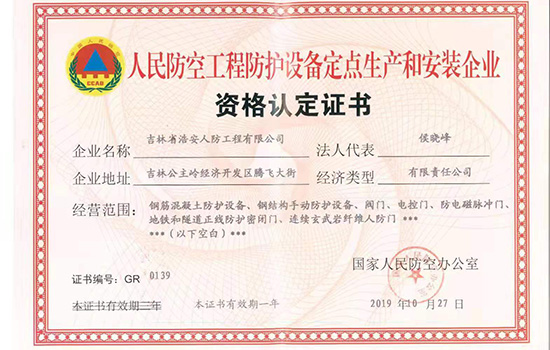 吉林省浩安人防工程有限公司是經(jīng)國家人民防空辦公室批準(zhǔn)成立的人防工程防護(hù)設(shè)備定點生產(chǎn)廠,2019年認(rèn)定為國家級高新技術(shù)企業(yè)。本廠擁有現(xiàn)代化的廠房及先進(jìn)的生產(chǎn)設(shè)備,集生產(chǎn)制造、質(zhì)量控制、銷售服務(wù)為一體的區(qū)域性行業(yè)廠。公司座落在吉林省公主嶺經(jīng)濟開發(fā)區(qū),占地面積達(dá)10000平方米,辦公樓1200平方米,廠房建筑面積達(dá)6000平方米以上,注冊資金1000萬元,企業(yè)的技術(shù)力量雄厚,其中防護(hù)工程師,高級工程師及中高級專業(yè)技術(shù)人員占30%。青海分公司2018年10月15日成立,于當(dāng)年11月26日通過 青海人民防空辦公室備案公示。 本廠經(jīng)營的主要產(chǎn)品:連續(xù)玄武巖纖維新型人防防護(hù)門、鋼結(jié)構(gòu)人防防護(hù)門、鋼筋混凝土人防防護(hù)門以及各種型號的通風(fēng)設(shè)備和防化設(shè)備。本廠生產(chǎn)設(shè)備齊全,擁有雄厚的生產(chǎn)能力和技術(shù)水平,并嚴(yán)格按照國家相關(guān)標(biāo)準(zhǔn)生產(chǎn)和安裝。2015年5月15日正式開業(yè)至今,承接吉林省人防工程項目上百項,總施工面積超過百萬平方米。工程項目包含人防指揮所、醫(yī)院、地下商場、商場、學(xué)